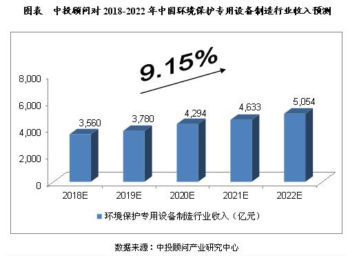 2018年我国环境保护专用设备制造行业收入将达到3,560亿元,未来五年(2018-2022)年均复合增长率约为9.15%,2022年将达到5,054亿元。