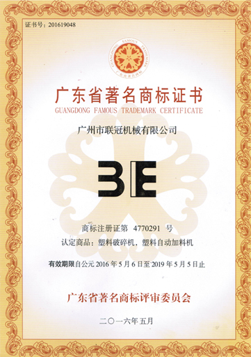 2016年7月,3E广州联冠机械有限公司的“3E”商标获得了广东省著名商标,为公司品牌战略的开展再添佳绩。荣誉的获得体现了客户、市场、权威机构对公司品牌及产品的信任与支持,是对公司全体成员不断努力、不断提升的专业肯定,是3E机械坚持专业粉碎和环保回收品牌发展道路中又迈出的坚实一步!
