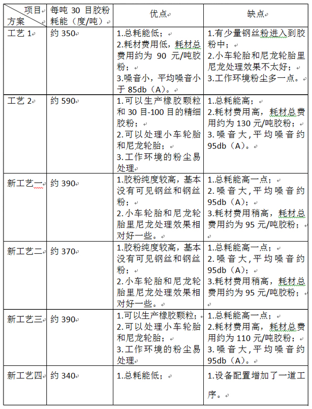 3E机械通过这几年面对不同客户的需求设计定制了这些方案,与国内常用的工艺1比较,在能耗方面只有新工艺四能耗稍低,而其他新工艺在能耗和耗材方面,都要比工艺1高,但是如果面对客户既要得到橡胶颗粒和橡胶粉以及40目以上的橡胶粉,或者客户处理小车轮胎和尼龙胎,那其他工艺又有它的优势,因此需根据客户实际情况来配置设备。