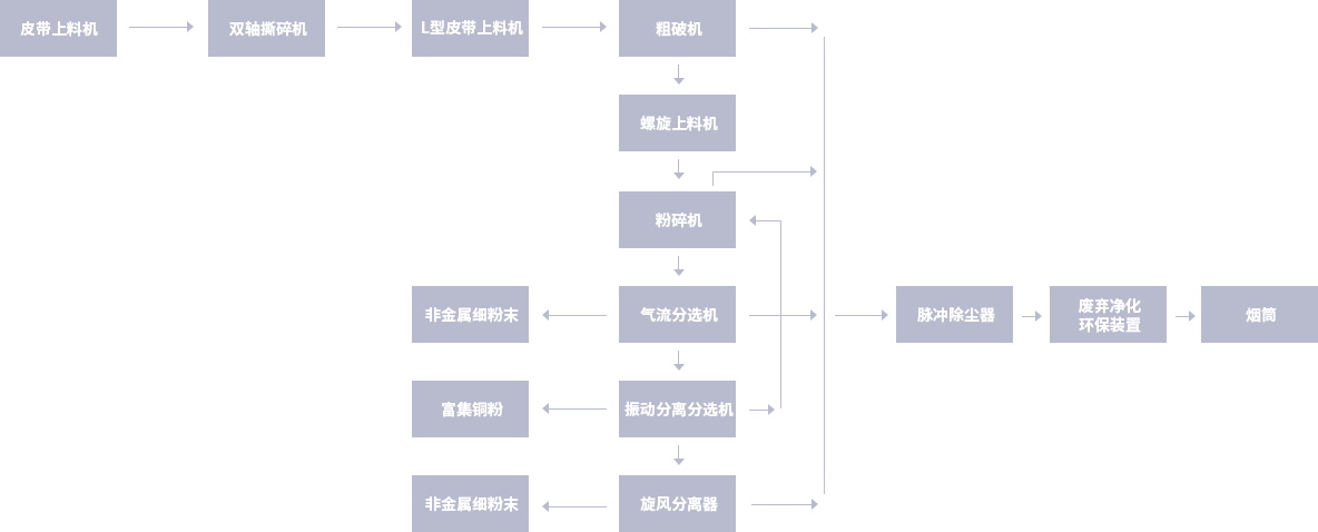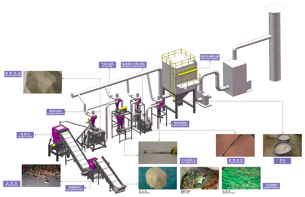 原料通过撕碎、粗破、粉碎、气流分选、振动重力分离分选、静电分选等物理环保处理工序,可分别回收到以铜为主的贵重金属混合体及非金属粉体混合体;生产过程中产生的粉尘和废气则有序地收集并统一进行除尘和废气净化处理,环保达标后对空排放。