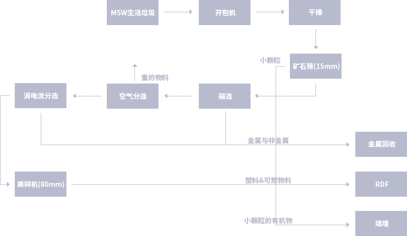 替代燃料(SRF/RDF)预处理系统,主要用对生活垃圾、布料进行分选和初碎。前端采用大处理量的预处理撕碎机和RDF高速撕碎机,高效节能环保! 生产线操作简易,通用性强,运作经济可靠,可以分选出高价值的城市矿山原料和RDF垃圾衍生燃料 !