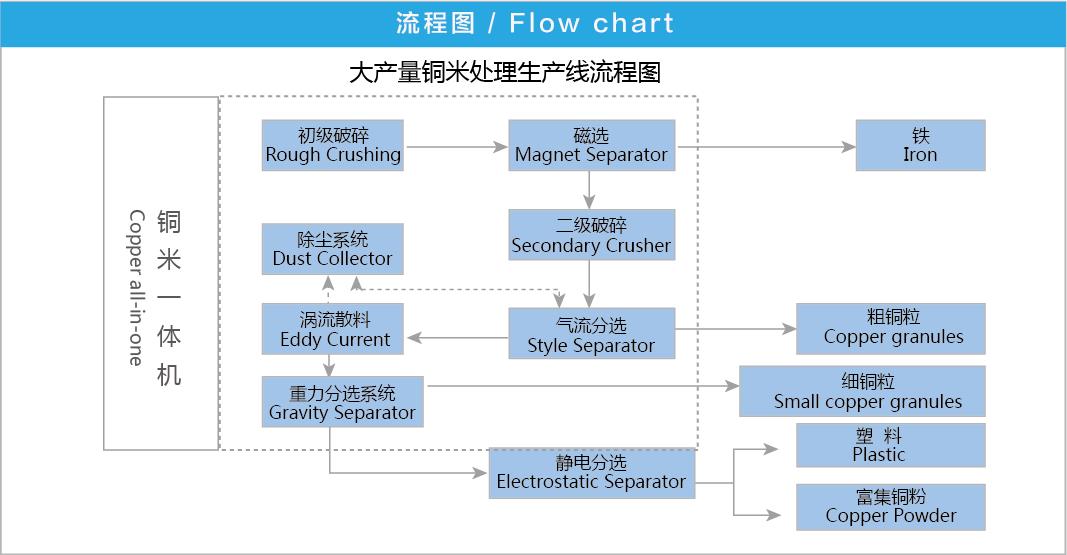 铜米一体机不需前期大 量人工分类废电线电缆,对主级线及低含铜量的电线也能得到很好的分选效果。 |